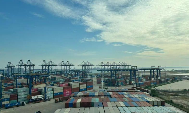 洋浦国际集装箱码头堆放的集装箱。(人民网)