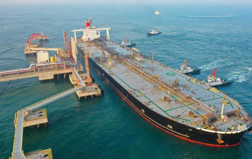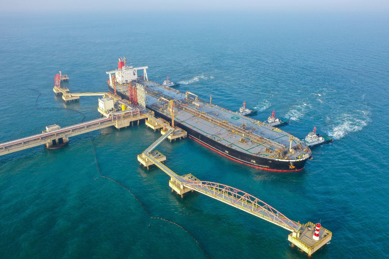 12月18日,一艘装载着石化原辅料的外籍船舶泊入国投洋浦油储码头30万吨级原油泊位(无人机照片)。(新华社)