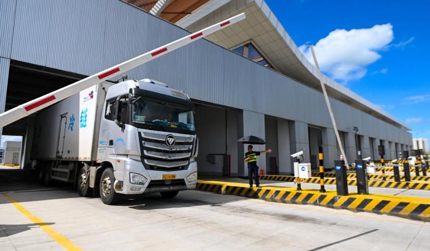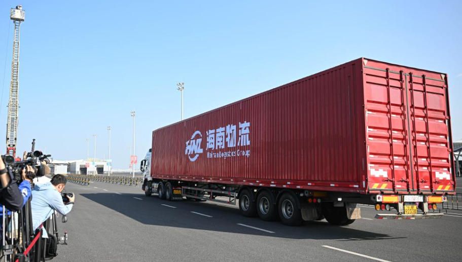 9月17日,离岛货车通过海口新海港和南港“二线口岸”(货运)集中查验场,开往港区。(新华社)