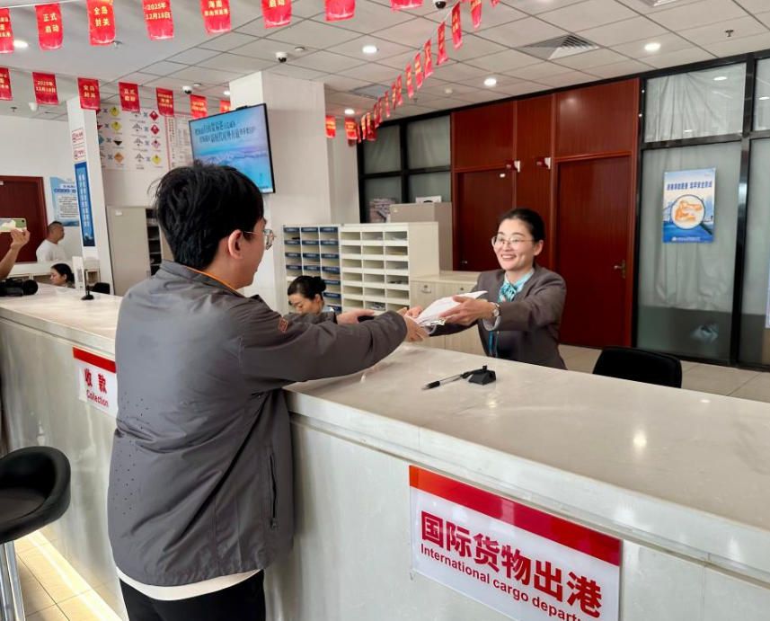 12月18日,开立生物医疗科技(海口)有限责任公司委托的物流代理人员在海口美兰机场国际货站提交提货单据,办理取货。(新华社)
