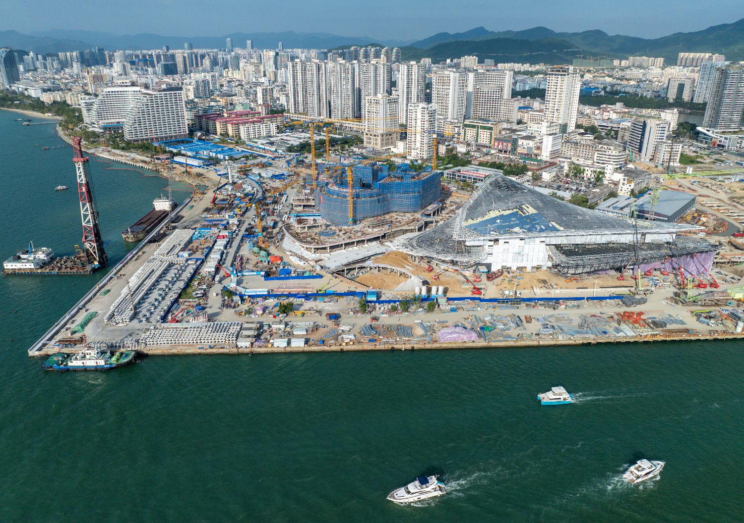 12月18日,海南自由贸易港正式启动全岛封关。自贸港建设7年来,海南着力推进一批重点项目建设,其中有些项目已建成投运,成为海南自贸港高质量发展的“助推器”。目前,海南自贸港正成为中国对外开放的新前沿、地区互利合作的新热土和推动经济全球化的新引擎。资料图为2025年11月22日,海南三亚,航拍中国海南国际文物艺术品交易中心和海南国际文化交流中心项目建设现场。中国海南国际文物艺术品交易中心项目是海南省重点建设项目,目前已完成屋面钢结构合拢,预计2026年上半年竣工。海南国际文化交流中心项目作为海南省重点工程,于2025年11月21日实现主体结构封顶,核心建设内容涵盖大剧院、多功能剧场、公众艺术体验空间及复合型文化服务设施。(无人机照片)(中新社)