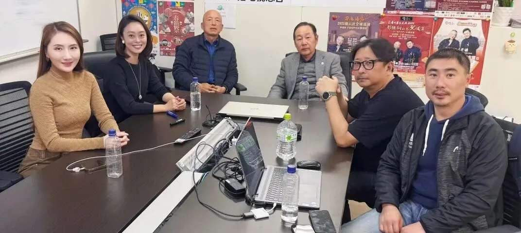 ▮马年春晚主创团队与主办方开碰头会。从左至右依次为:副导演刘璇,导演邵晓男,全华联理事长贺乃和,全华联会长张书明,艺术总监刘斌,全华联事务局长徐佳锐。