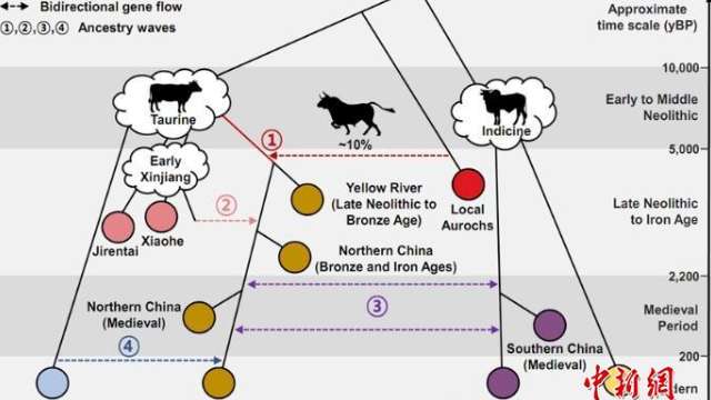研究表明,距今约5000年前的新石器时代晚期,普通牛(Bos taurine)传入黄河流域并与本土野生原牛发生基因交流;新疆地区的早期家牛受到西亚普通牛和南亚瘤牛(Bos indicus)的共同影响,自青铜时代晚期至铁器时代不断向黄河流域渗透,持续影响了中国北方家牛的遗传结构。铁器时代至明清时期,南北方牛群进一步融合,最终奠定了现今中国南北方家牛的基本遗传框架。