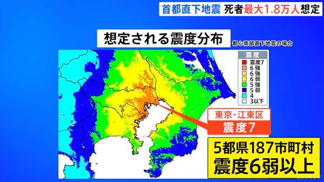 根据这份由政府组织专家工作组经过约两年讨论修订的最新损害评估报告,日本首都圈一旦发生被称为“东京市中心南部直下型地震”的强震,首都圈范围内的震度很可能达到6强以上。预计包括茨城县、埼玉县、东京都、千叶县和神奈川县在内的五个都县的多达187个市町村将经历强烈摇晃;其中东京都江东区的震度预计可能达到最大震度7级。