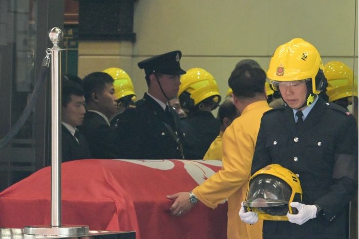 当日10时30分许,在哀乐声中,多名消防员为何伟豪扶灵,一人手捧消防头盔,护送盖有香港特区区旗的灵柩运上由消防车改装的灵车。