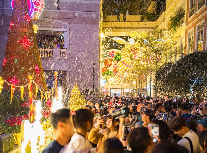 当地时间12月20日晚,香港利东街人造雪花飘落,为即将到来的节日增添喜庆氛围。(图/中新社)