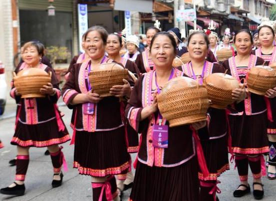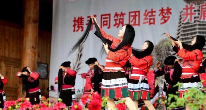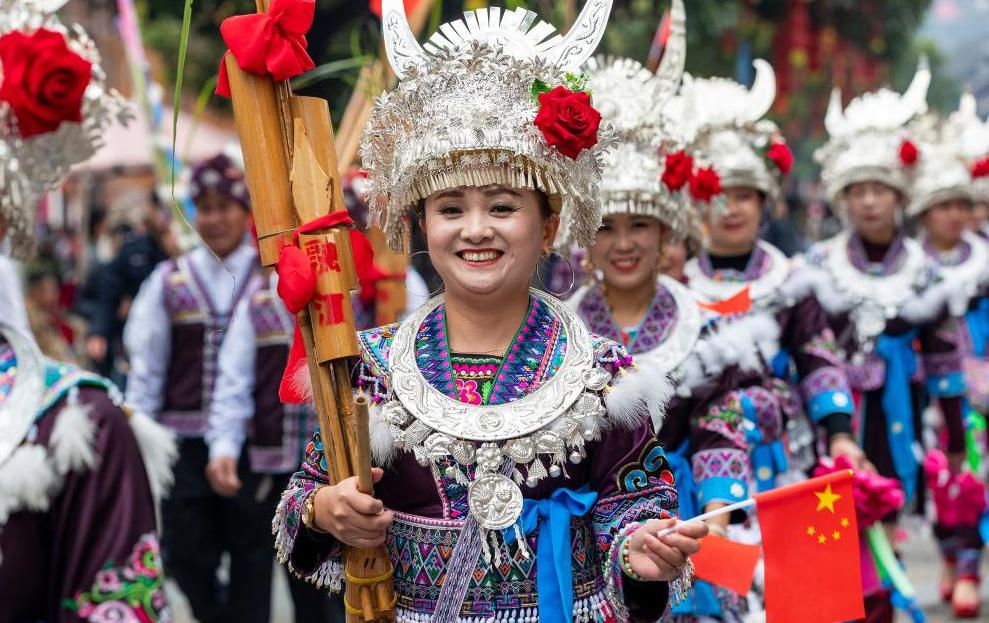 侗年是侗族同胞团圆、庆贺丰收的节日,像汉族过春节一样热闹,当地开展民族团结大巡游、“村舞”斗舞大会、芦笙赛、长桌宴等特色活动,吸引众多游客前来旅游体验。2011年,侗年被列入国家级非物质文化遗产名录。图为广西龙胜村民在参加民俗巡游活动。(中新网)