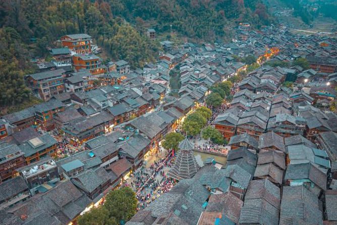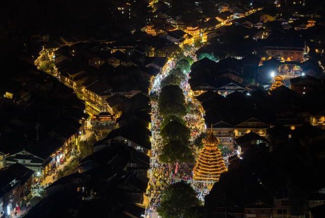 当地时间12月20日晚,航拍贵州省黎平县肇兴侗寨。(中新网)