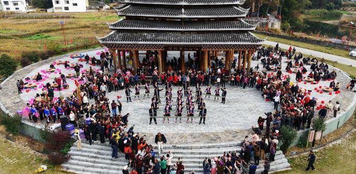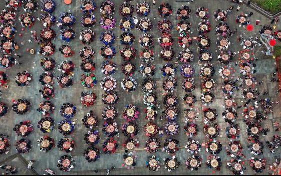 图为广西龙胜村民和游客在共享百家宴。(无人机照片)(中新网)