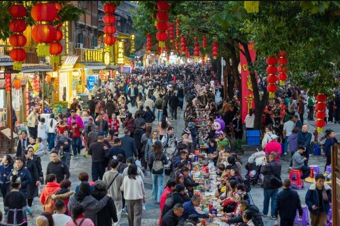 12月20日,贵州省黎平县肇兴侗寨,游客在吃长桌宴。(中新网)