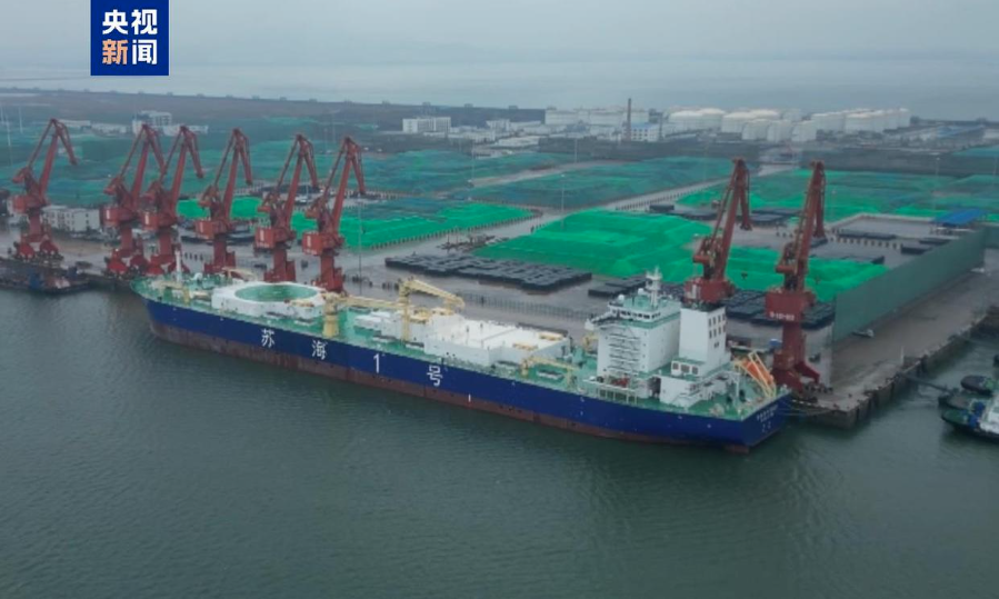 12月23日,全球首艘三文鱼养殖工船“苏海1号”在江苏连云港赣榆首次投放三文鱼苗。(图/中国央视新闻)