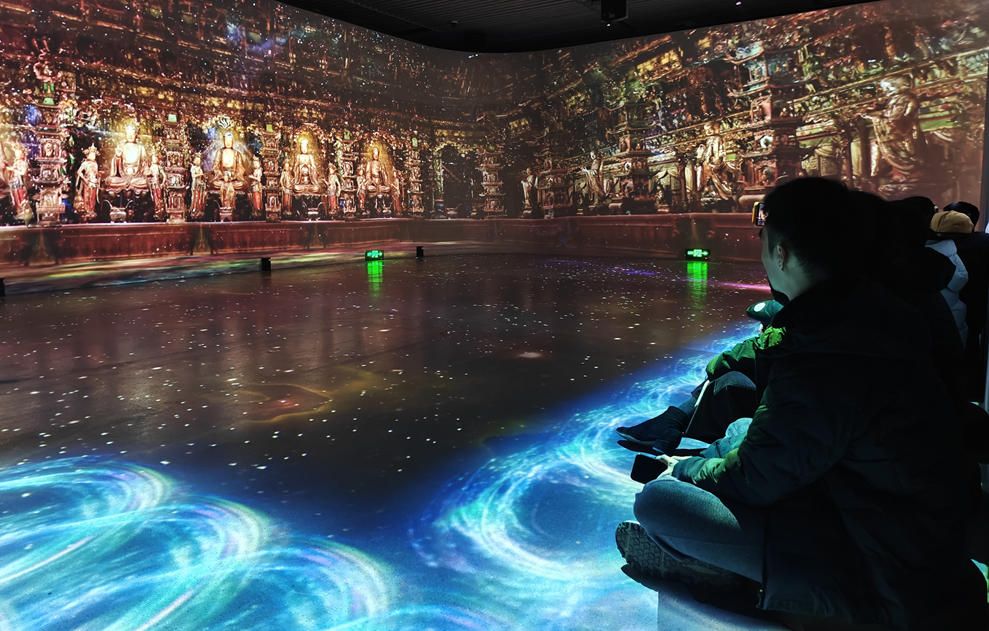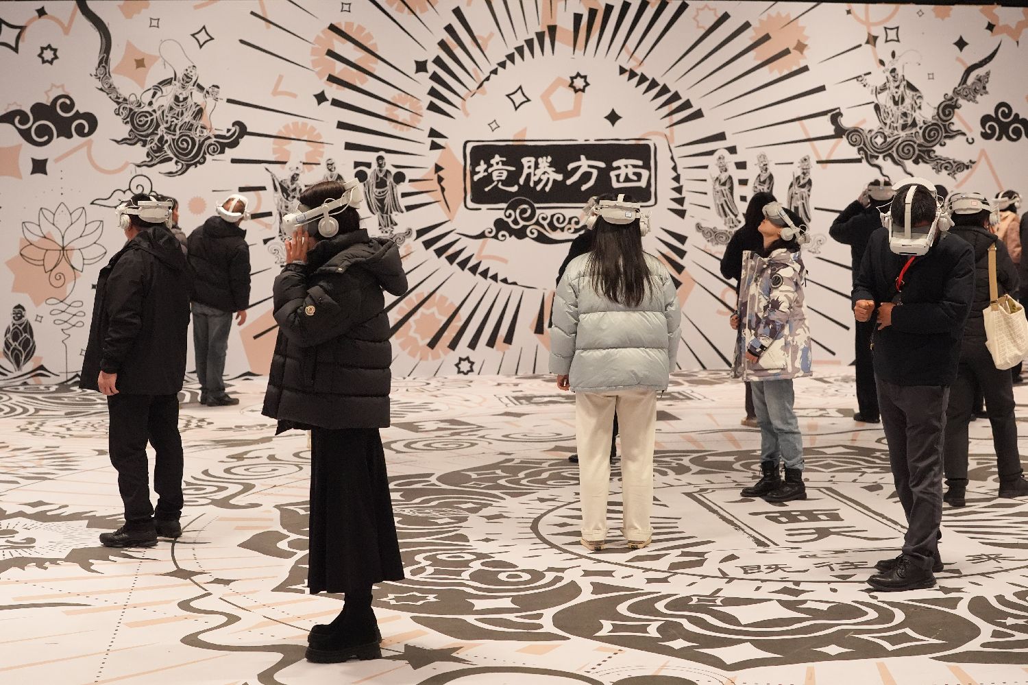12月22日,观众通过VR眼镜感受数字化小西天悬塑。(中国日报)