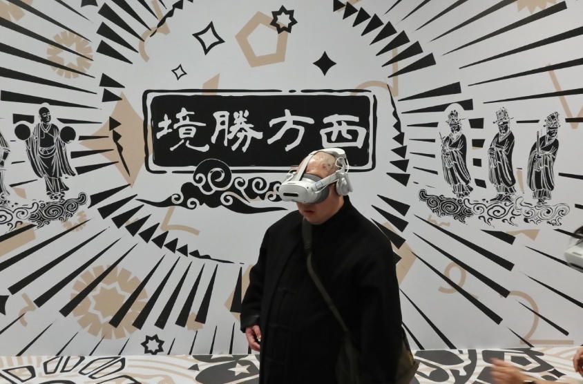 图为嘉宾戴着VR眼镜感受数字化小西天悬塑。(中新社)