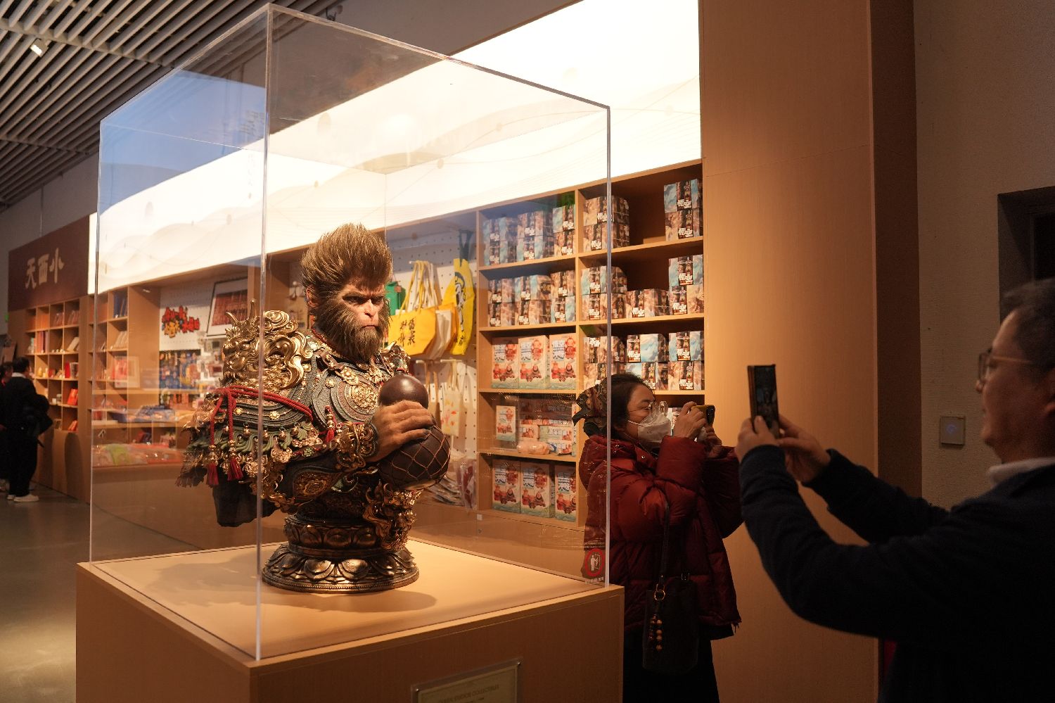 图为《黑神话·悟空》天命人半身像等文创产品吸引嘉宾。山西隰县小西天是《黑神话·悟空》的取景地。(中新社)