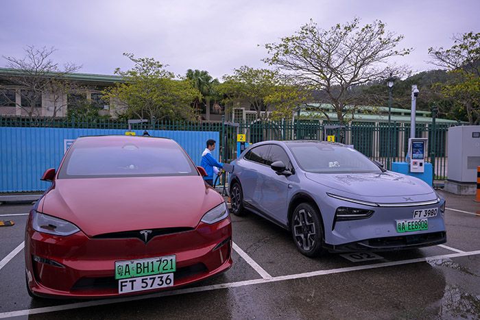 12月23日,香港特区政府运输署与中电源动集团合作在大屿山竹篙湾设立的充电设施正式启用,为“粤车南下”及“港车北上”旅客提供配套支持。图为电动汽车停泊在大屿山充电站。(图/中新社)