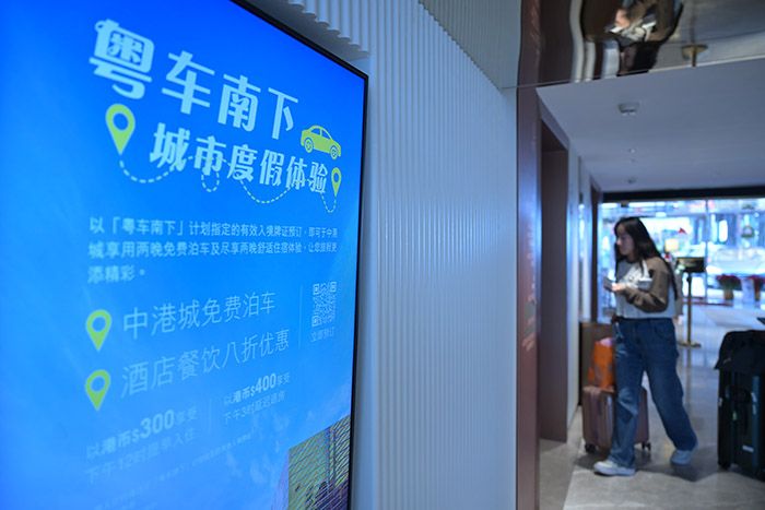 在位于尖沙咀的中港城,商场中庭咨询台已张贴着有关“粤车南下”的相关宣传海报,服务人员也在胸牌上注明可使用“普通话”提供服务。商场面向来此购物的“粤车南下”车主,推出大额消费礼券包,并对地下停车场进行改造升级,配备新能源汽车使用的国标充电桩及泊车位。
