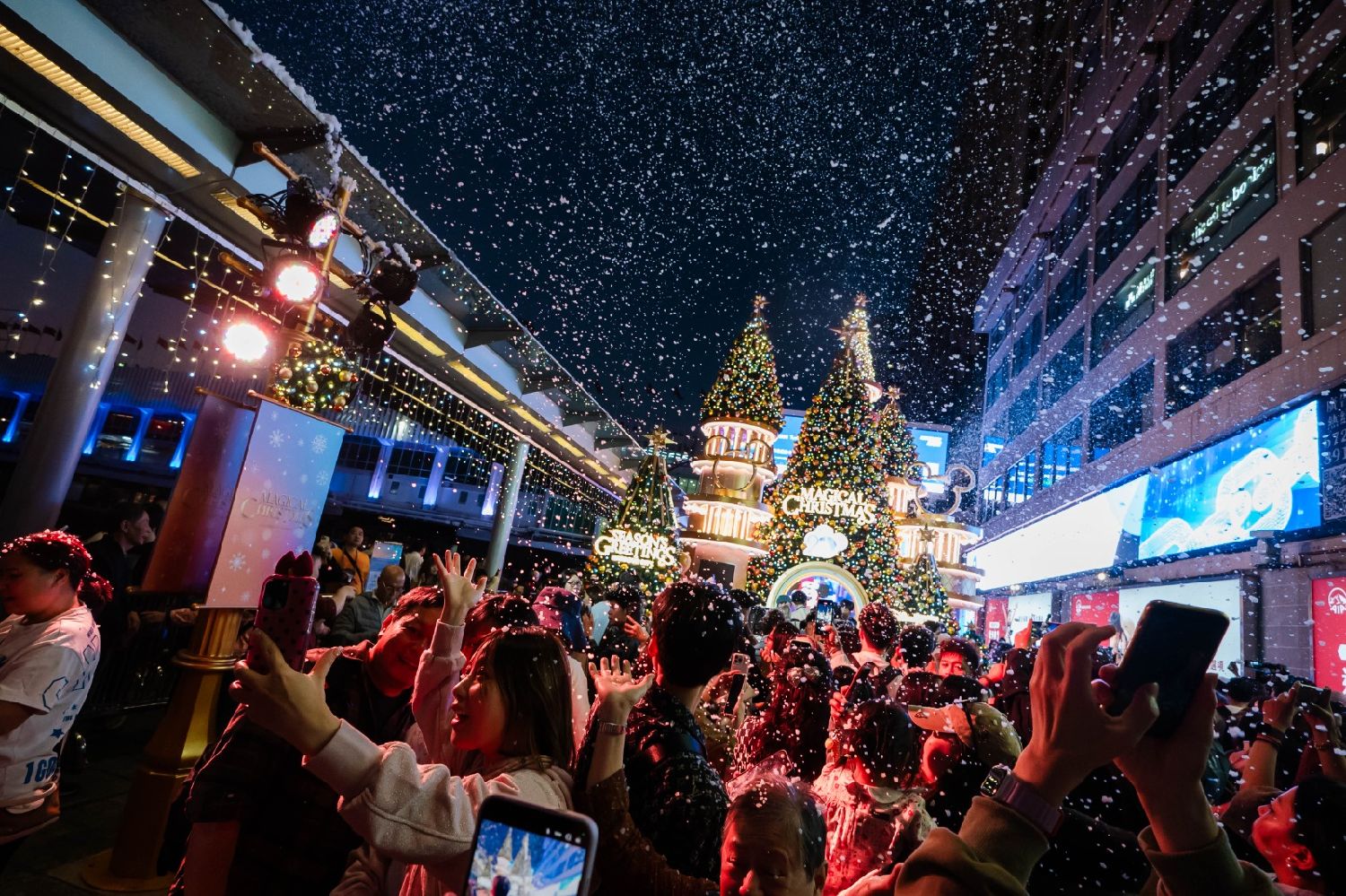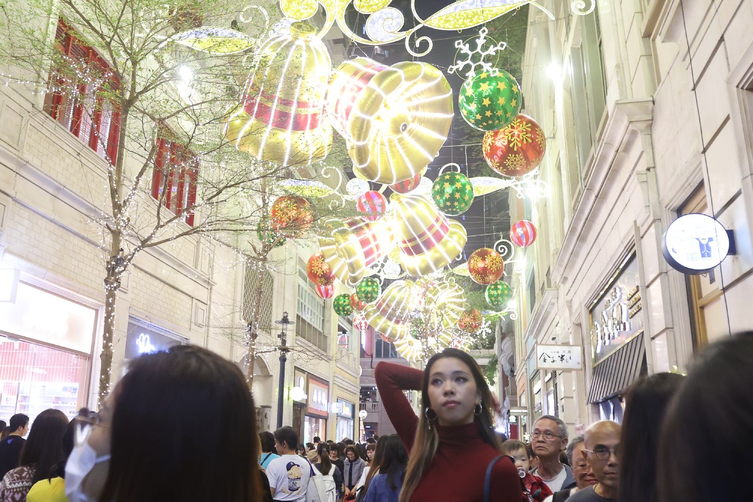 图为12月24日,中国香港,湾仔利东街光影嘉年华热闹非凡,市民体验“白色圣诞”。(香港中通社)