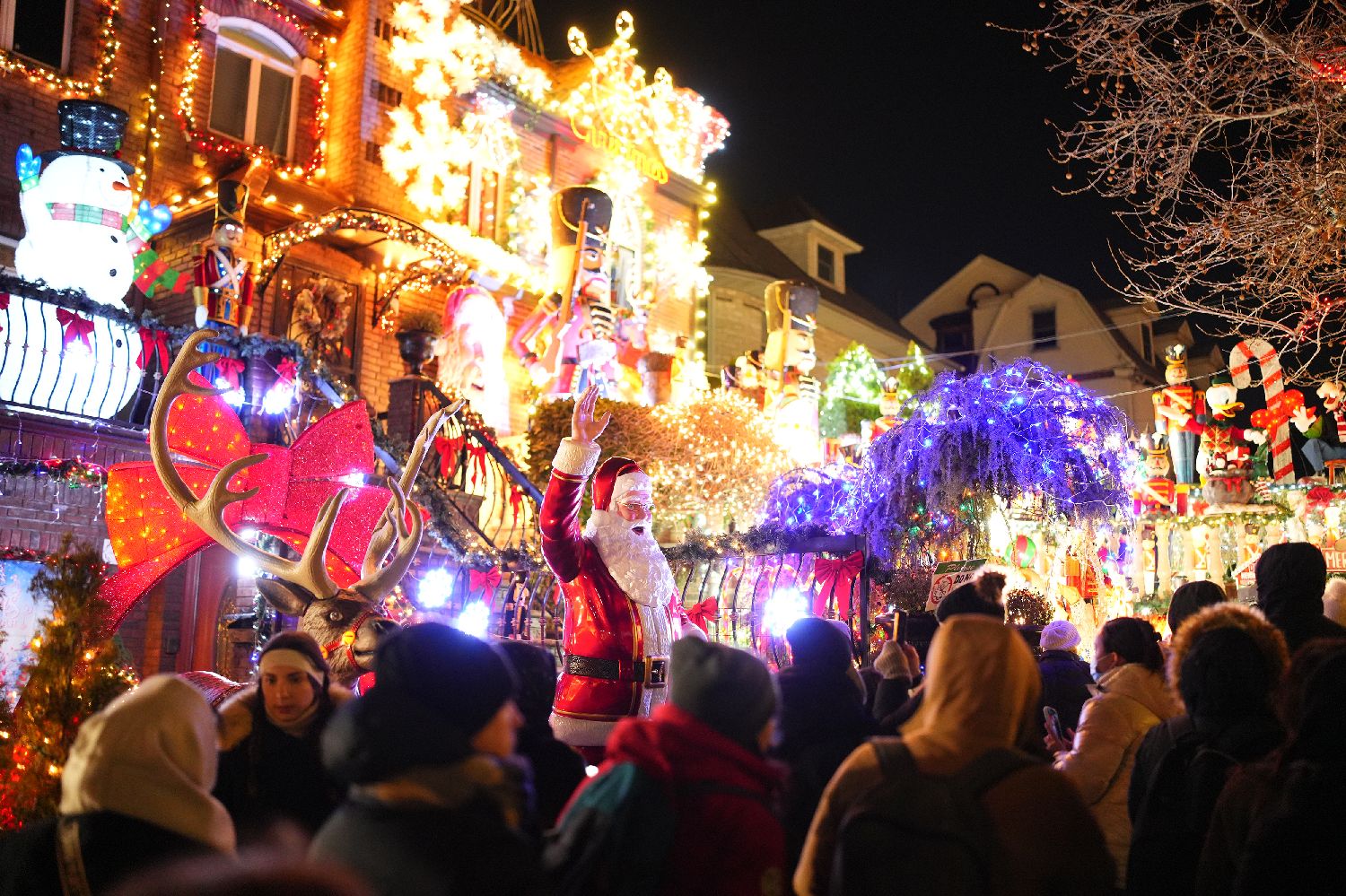 图为12月22日,美国纽约,人们慕名来到纽约布鲁克林戴克高地,欣赏这里居民在房屋周围布置的圣诞灯饰。戴克高地的居民每年都精心打造自家门前的圣诞灯饰,五光十色的街区宛如童话世界。(中新社)