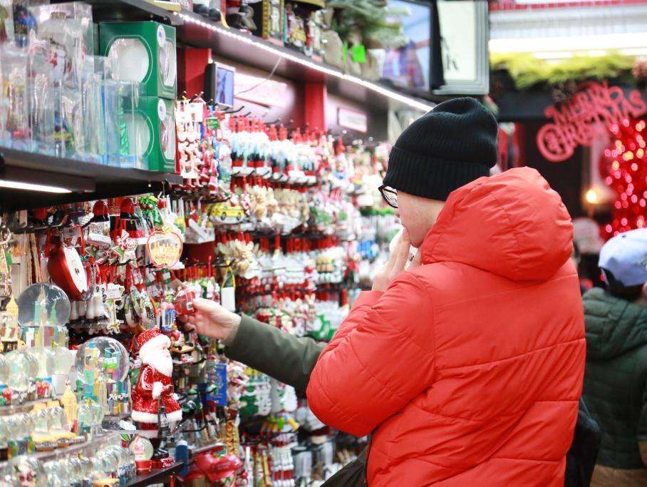 图为12月22日,美国纽约,顾客在纽约曼哈顿中城地区第七大道上的“圣诞小屋”礼品店内选购商品。(新华社)