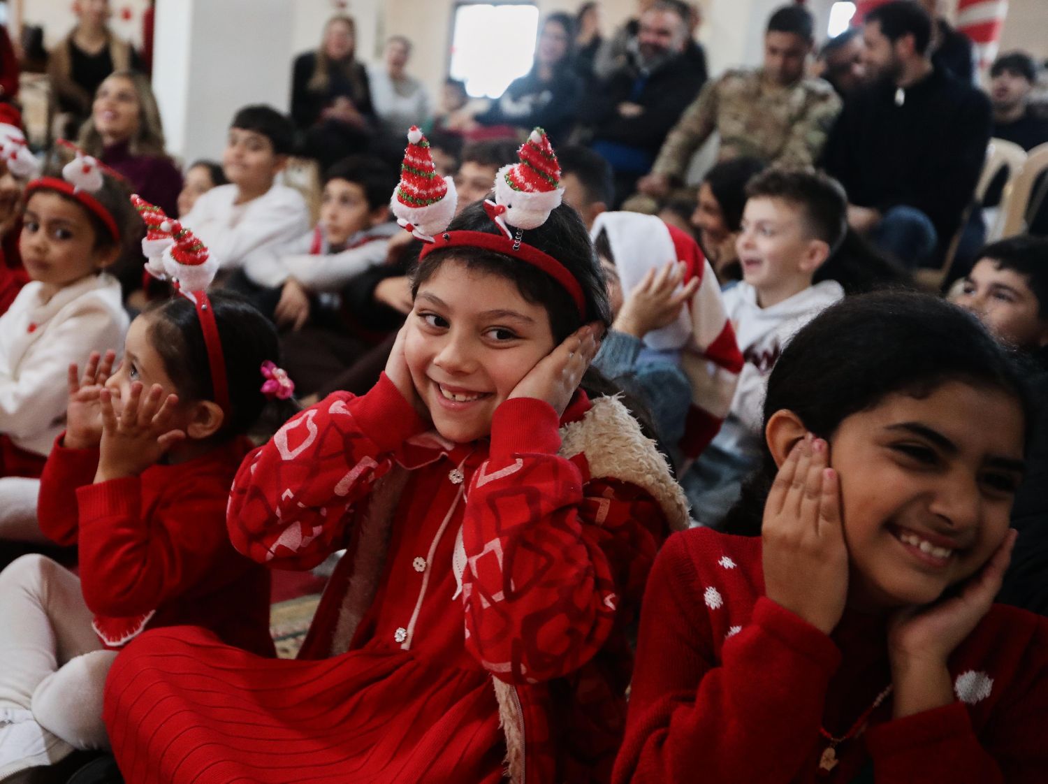 图为12月24日,黎巴嫩南部边境村庄阿尔马沙阿卜,孩子们庆祝平安夜。(CFP)