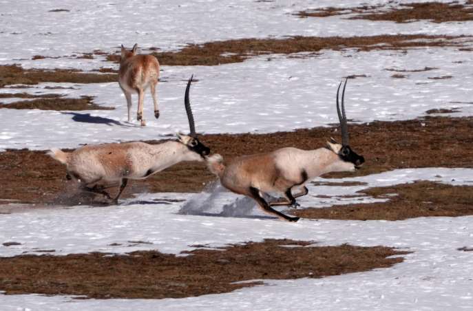 次成塔青介绍,进入交配期的藏羚羊雌雄合群,雄性藏羚羊通过追逐、打斗争夺交配权,“雄性藏羚羊追逐打斗过程中,因为羊角撞击,很容易受伤。这时候我们只能观察,不能干扰。”