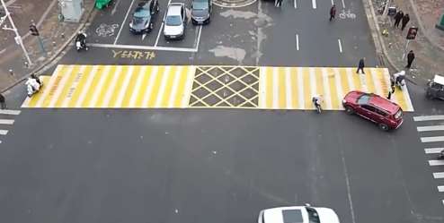 当地时间早晨7时30分,郑东新区一小学门口已是车来车往。与以往不同的是,学校附近的斑马线不再是单调黑白两色,黄白相间彩色线条在路面上格外醒目。