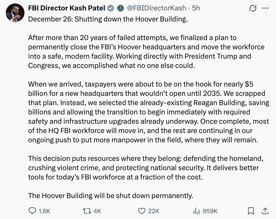 当地时间12月26日,美国联邦调查局(FBI)局长卡什·帕特尔宣布,作为FBI的办公大楼,长期象征着美国国内安全核心力量的约翰·埃德加·胡佛大楼将被“永久关闭”。帕特尔在社交媒体上写道,这座“象征历史但早已不合时代的建筑”将被彻底腾空,FBI总部职能将迁入此前美国国际开发署(USAID)所在的罗纳德·里根大厦。