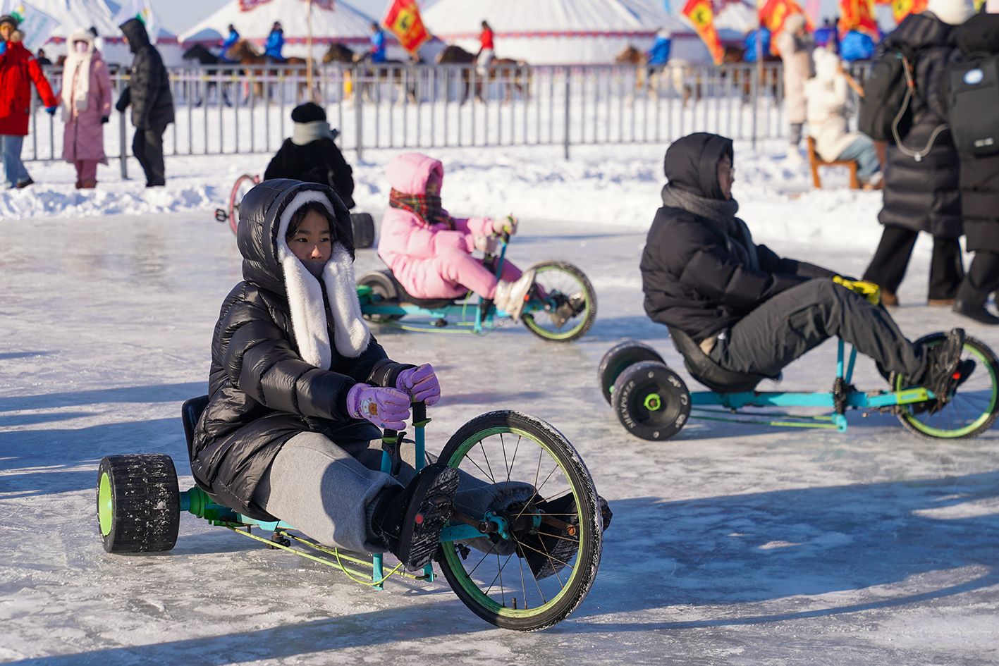 12月27日,2025黑龙江“冷水鱼·冬捕季”系列活动大庆连环湖第九届冰雪渔猎那达慕在大庆市杜尔伯特蒙古族自治县启幕。本次活动以渔文化为核心,设有“祭湖醒网”仪式、冬捕等传统项目,还融合了冰雪竞技、雪地温泉等内容。图为游客在活动现场体验冰上活动。(中新社)