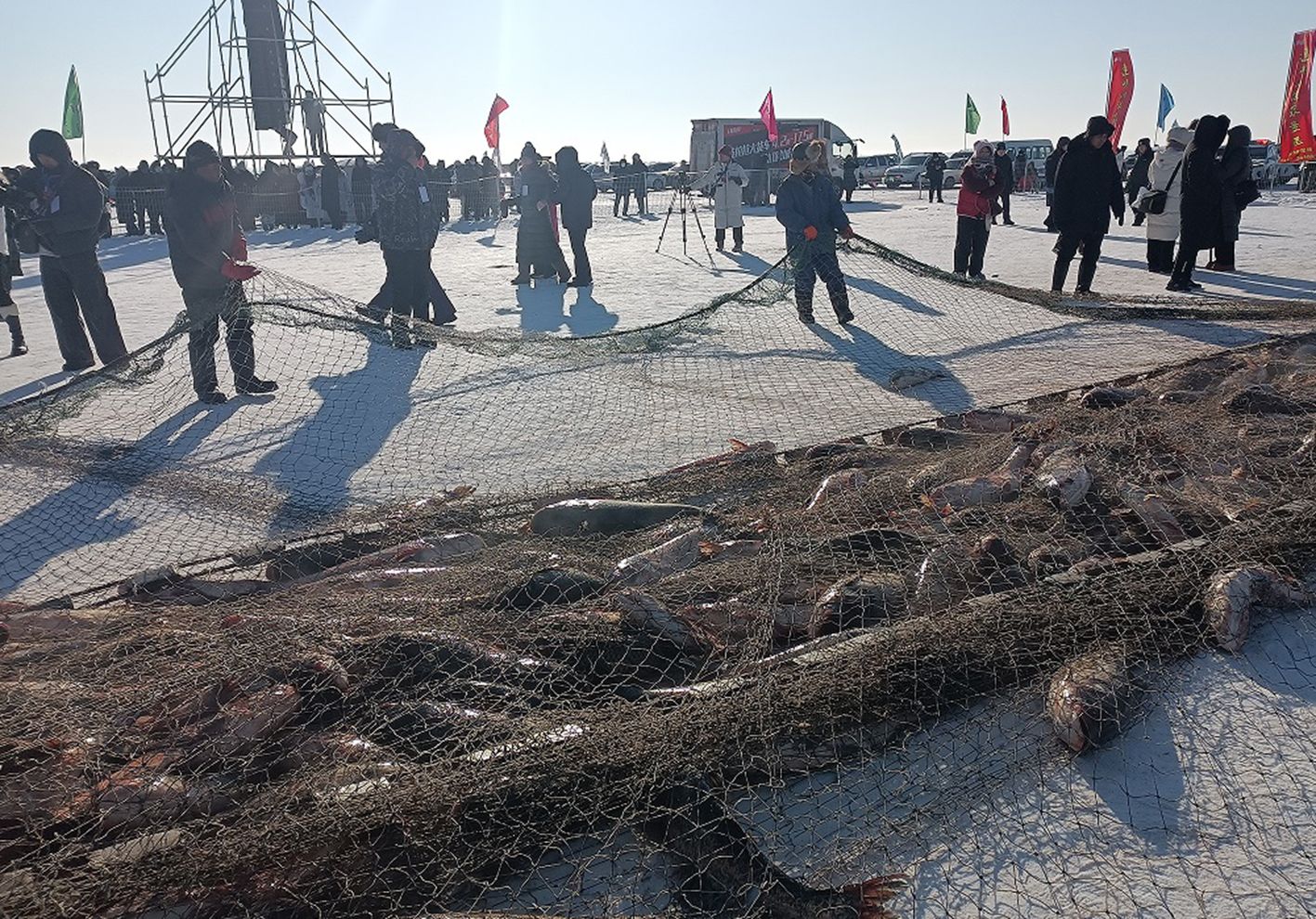 活动现场,举行了“祭湖·醒网”、捕鱼起网、头鱼拍卖、电商直播等活动,并融入蒙古族特色冰雪渔猎那达慕、马队展示、冬泳冬钓、冰雪乐园、美食品鉴、百福鱼廊等内容。