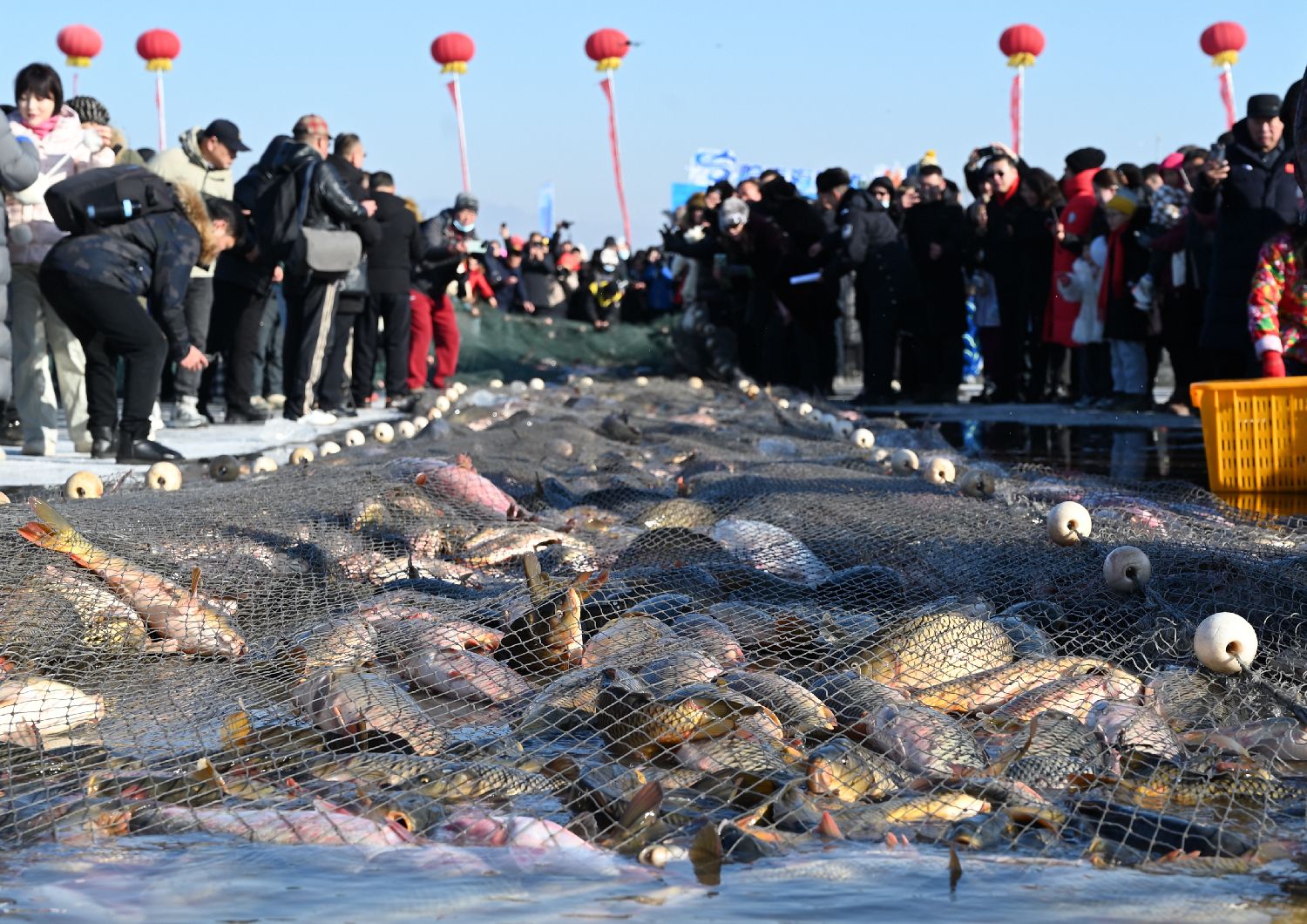 2024年1月10日,内蒙古呼和浩特市,冬捕鱼个头普遍偏大,以鲤鱼、鲢鱼为主。当日,哈素海第三届冬捕节在呼和浩特市开幕。据统计,冬捕节当天接待游客2.3万人,线上线下售出冬捕鱼7000多条,共2万多斤。(图/中新社)