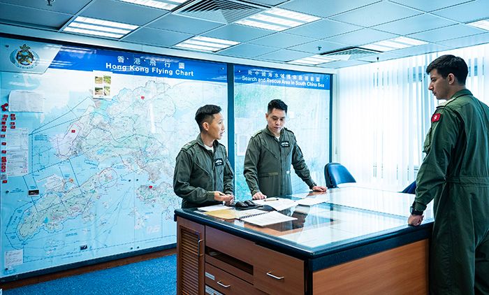 10月22日,香港特区政府飞行服务队副经理(飞行行动)、定翼机机长陈永炽(左一)执飞前与机组成员交流信息。 (图/中新社)