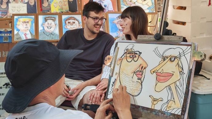 今年“五一”,意大利游客在静安寺公园的集市上体验街头画像。(图/上海上观新闻)