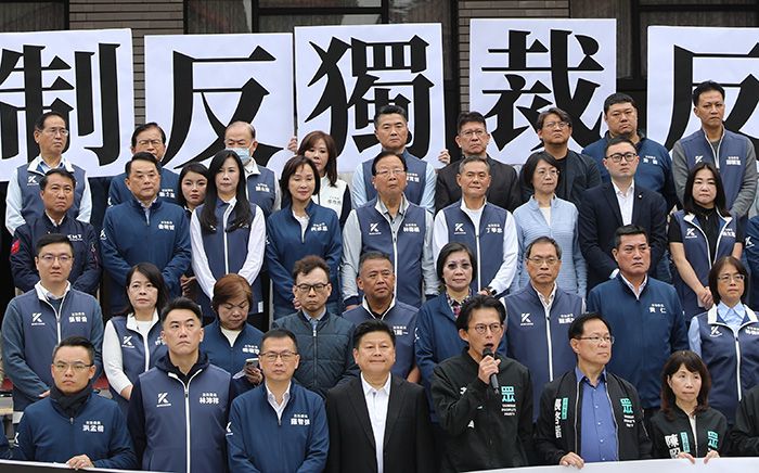 12月19日,中国国民党和台湾民众党的民意代表在台湾当局立法机构议场前举行记者会,宣布提案弹劾台湾地区现任领导人赖清德。(图/中新社)