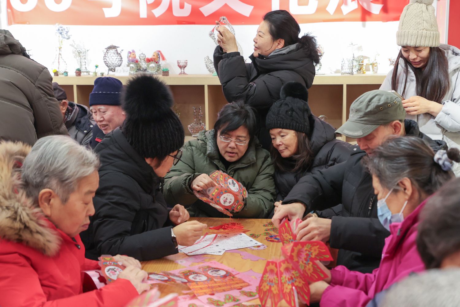 图为12月30日,中国北京,朝阳区小关街道“花惠万家”共育项目活动在惠新西街33号院举行,社区居民手工拼制“喜万莲”彩灯,迎接新年到来。(中新社)