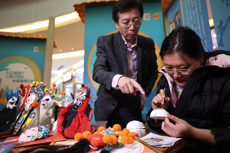 图为12月30日,中国北京,“文艺赋能·助力发展”共创美好CBD欢乐“艺”小时活动(跨年专场)在北京财富购物中心精彩上演,市民描画京剧脸谱。(北京《新京报》)