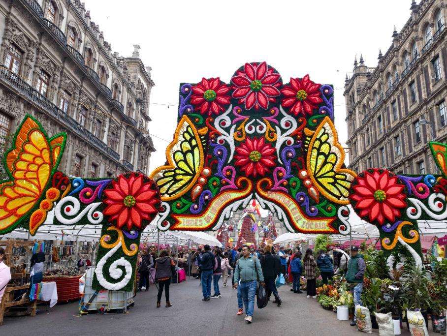 图为12月30日,墨西哥首都墨西哥城,城内多地装点节日装饰,洋溢着新年的喜庆气氛,人们走过宪法广场附近的节日装饰。(新华社)