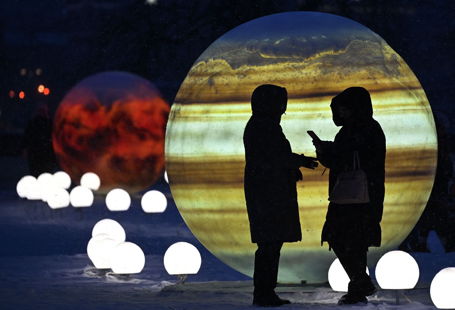 图为12月30日,俄罗斯圣彼得堡市中心,人们在行星造型的新年装饰中漫步。(CFP)
