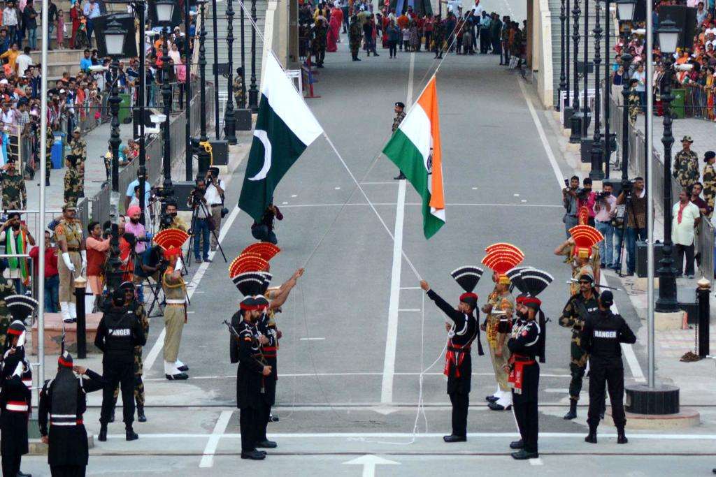图为在巴基斯坦东部拉合尔附近与印度交界的瓦格赫口岸,巴基斯坦(前)和印度两国的仪仗兵参加降旗仪式。(图/新华社)