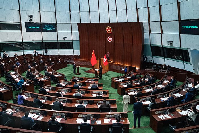 这是完善香港特区选举制度后产生的第二届立法会。当地时间当日上午,宣誓仪式在立法会综合大楼会议厅举行,国徽和区徽高悬主席台上方,下方分别树立着国旗与区旗,宣誓席与监誓席相向而立。