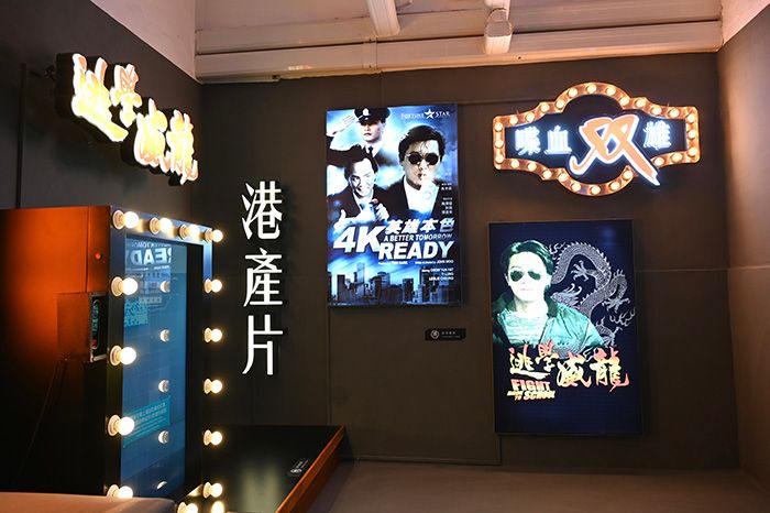 展览共有四个场景:“戏院门口”“时光隧道”“杂差房”和“羁留室”。来到展览现场,参观者穿过电影时光隧道,进入众多于警匪电影中出现的场景。展区融合了多媒体展示、互动体验装置及AI照相亭等,参观者可以化身电影角色,在多个打卡位合影留念。