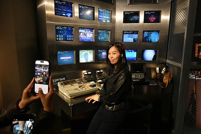 图为一名女士与“监控室”设施合影。(图/中新社)