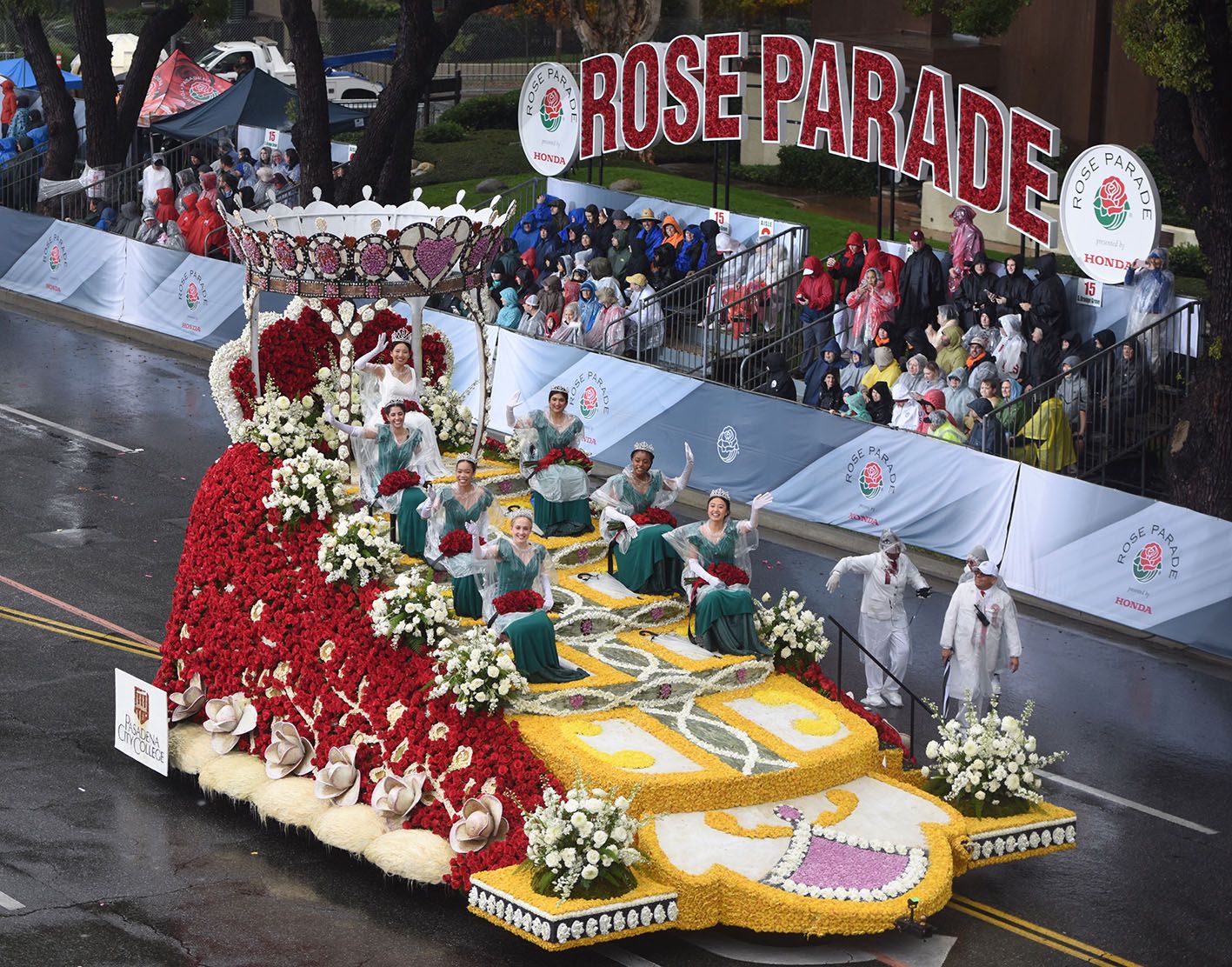 1月1日,第137届玫瑰花车游行在美国加利福尼亚州帕萨迪纳市举行,人们在雨中迎接新年的到来。2026年玫瑰花车游行主题是“团队合作的魔力”(TheMagicinTeamwork),旨在颂扬携手合作、共同取得更丰硕成果的精神和力量。图为2026年度“玫瑰皇后和玫瑰公主”花车。(中新社)