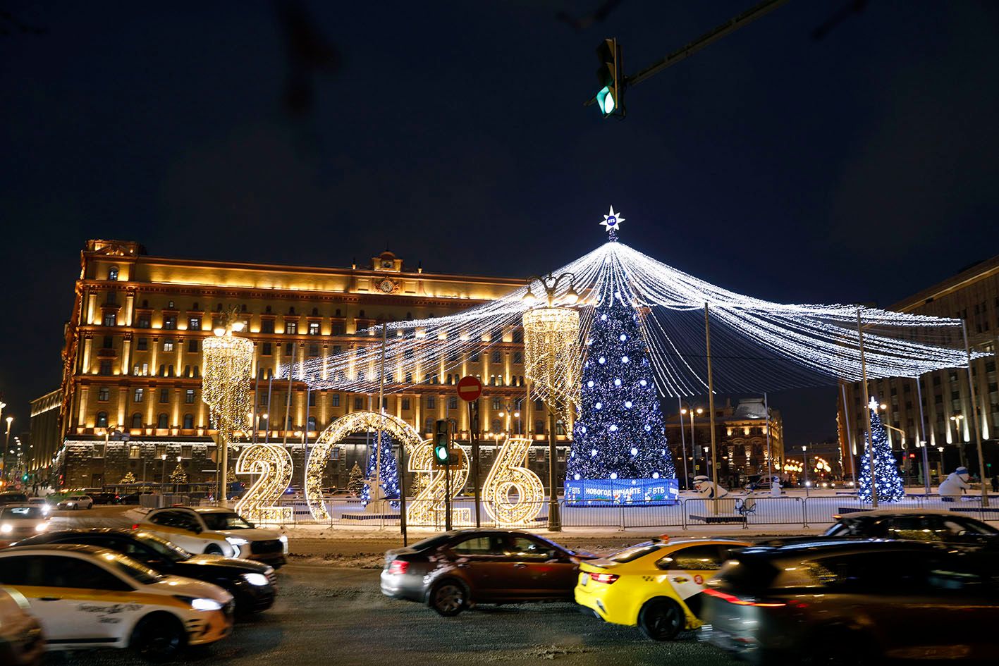 2025年12月31日,俄罗斯首都莫斯科,民众迎接新年。图为卢比扬卡广场上的新年装饰。(中新社)