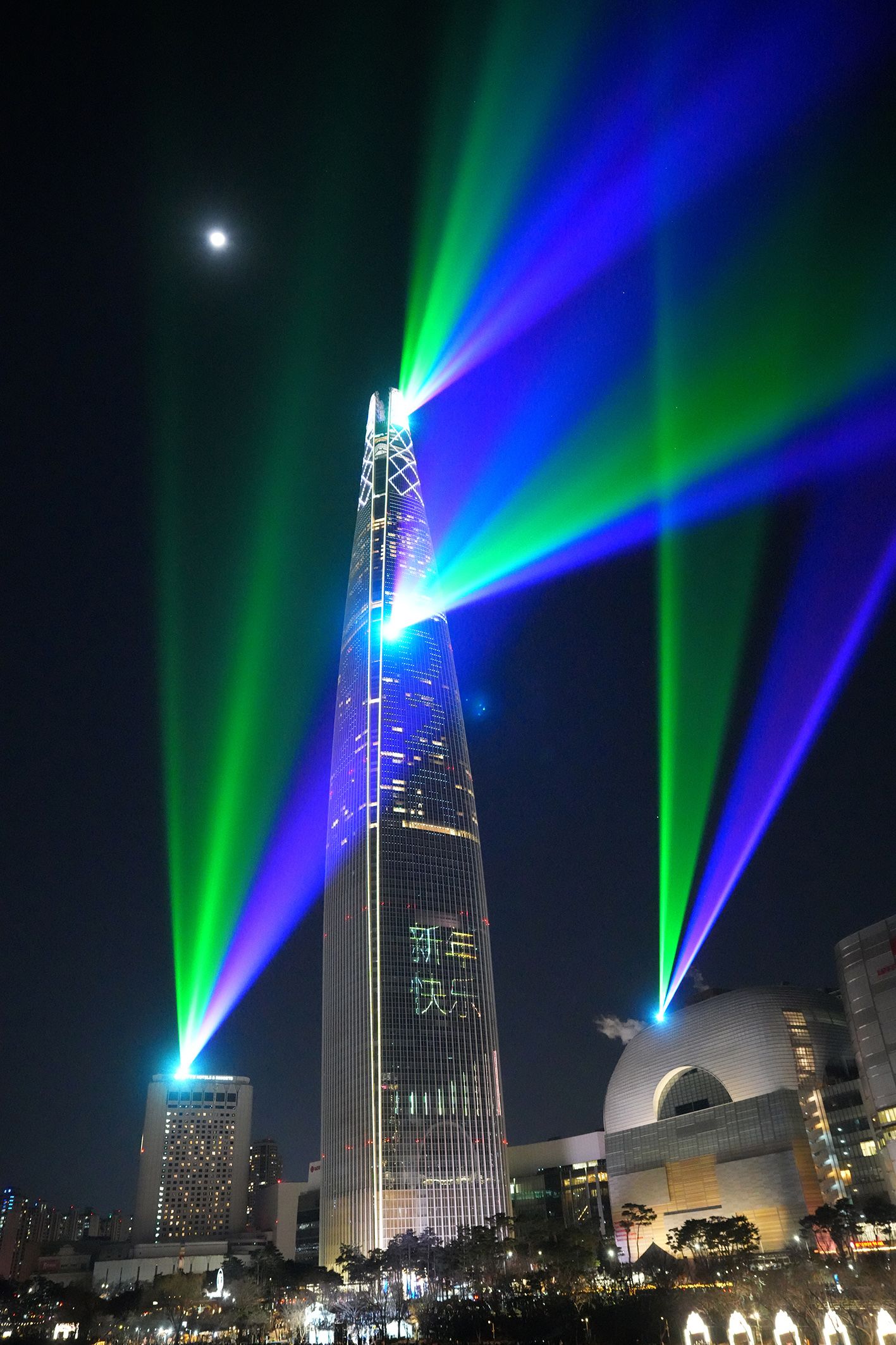 当地时间2025年12月31日晚间,首尔乐天世界塔举办跨年灯光秀。2025年12月31日晚间至2026年1月1日凌晨,首尔普信阁、乐天世界塔和光化门等多地举办跨年庆祝活动。(中新社)