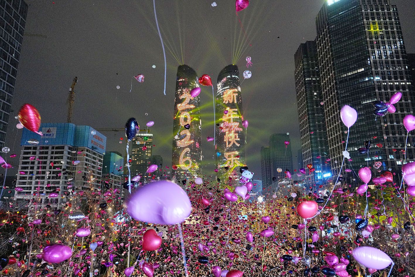 1月1日,“成都为你点亮”交子大道跨年活动在成都市高新区交子大道举行,活动以“以梦为马,‘心’耀蓉城”为主题,数万民众和游客来到天府双塔下迎接新年到来。图为民众天府双塔下迎接新年。(中新社)