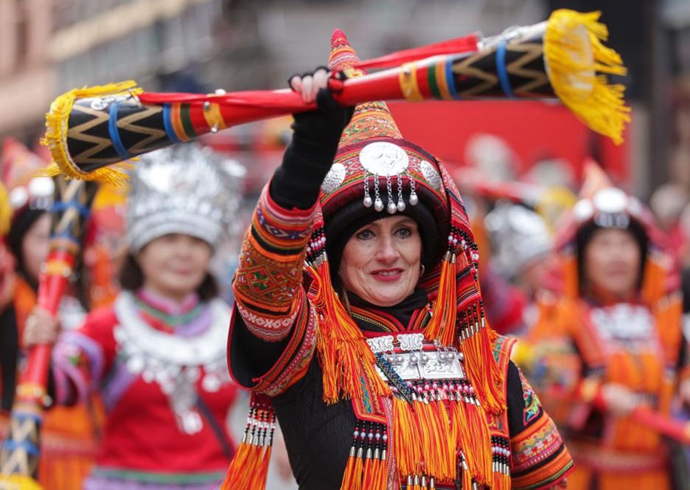 1月1日,在英国伦敦,人们参加新年游行活动。(新华社)