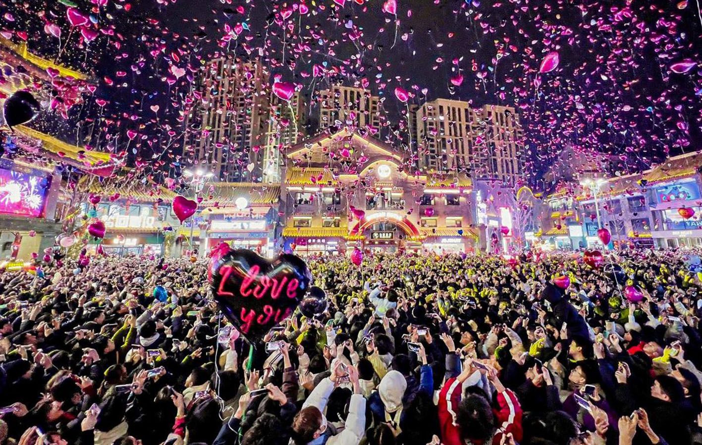 1月1日凌晨,人们在甘肃省兰州市七里河区老街放飞心愿气球迎新年。(中国日报网)