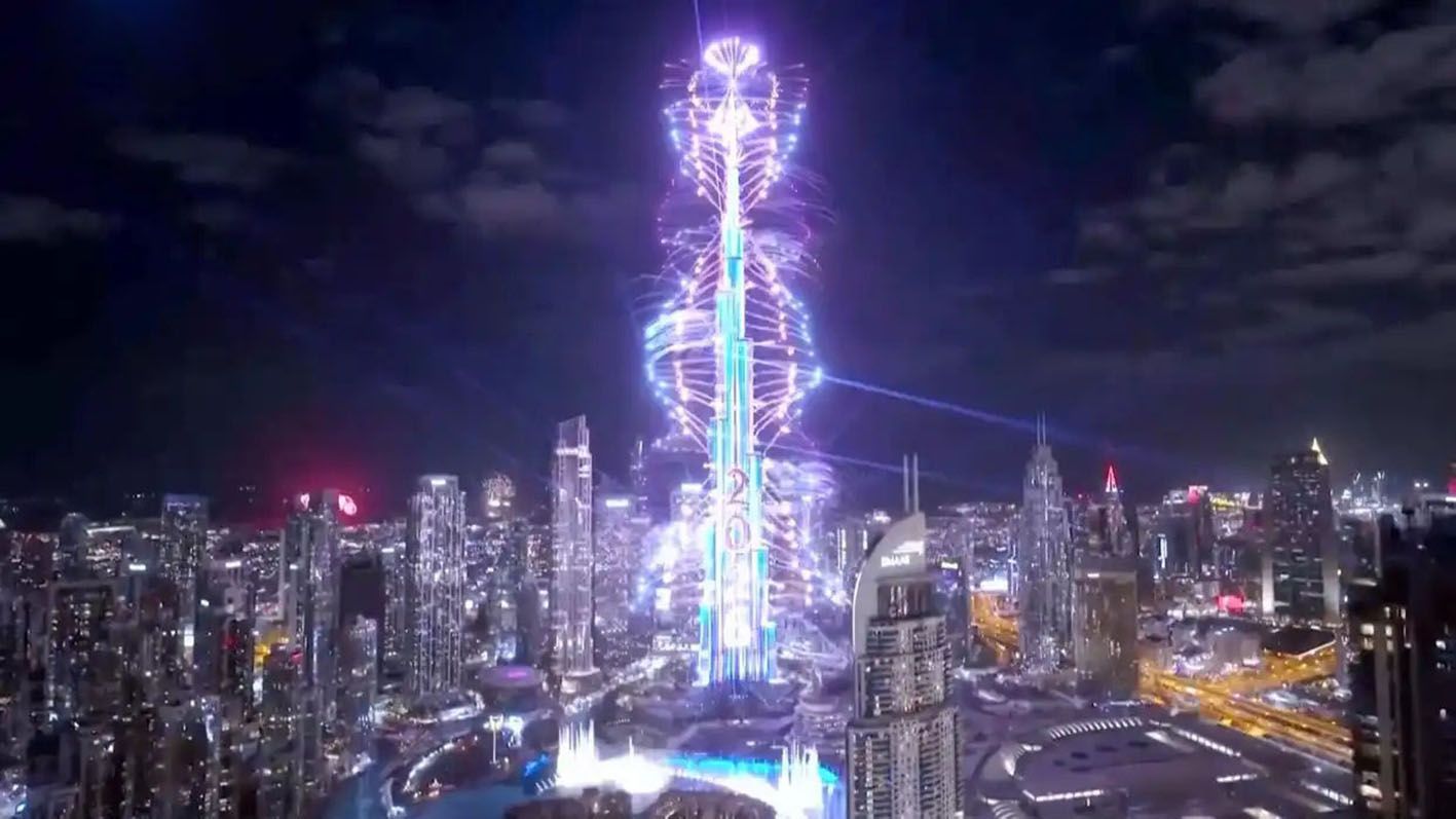 阿联酋迪拜地标性建筑、世界第一高楼哈利法塔呈现了一场精彩的跨年灯光烟花秀。在现场观众的倒计时和欢呼声中,828米的哈利法塔楼体LED屏用多种语言显示出“新年快乐”。(中国央视新闻客户端)
