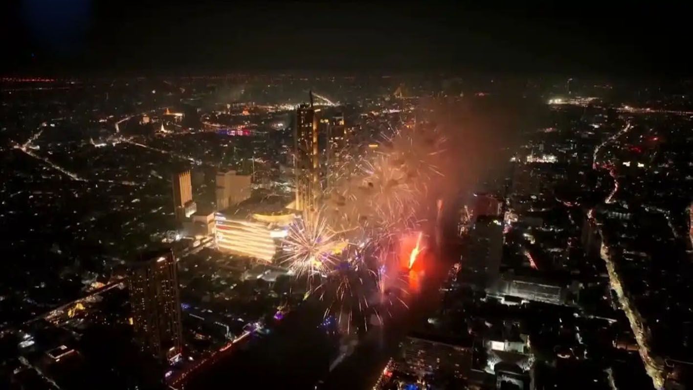 泰国跨年烟花秀在首都曼谷湄南河上空上演,数万枚烟花配合无人机呈现了20分钟的表演。(中国央视新闻客户端)