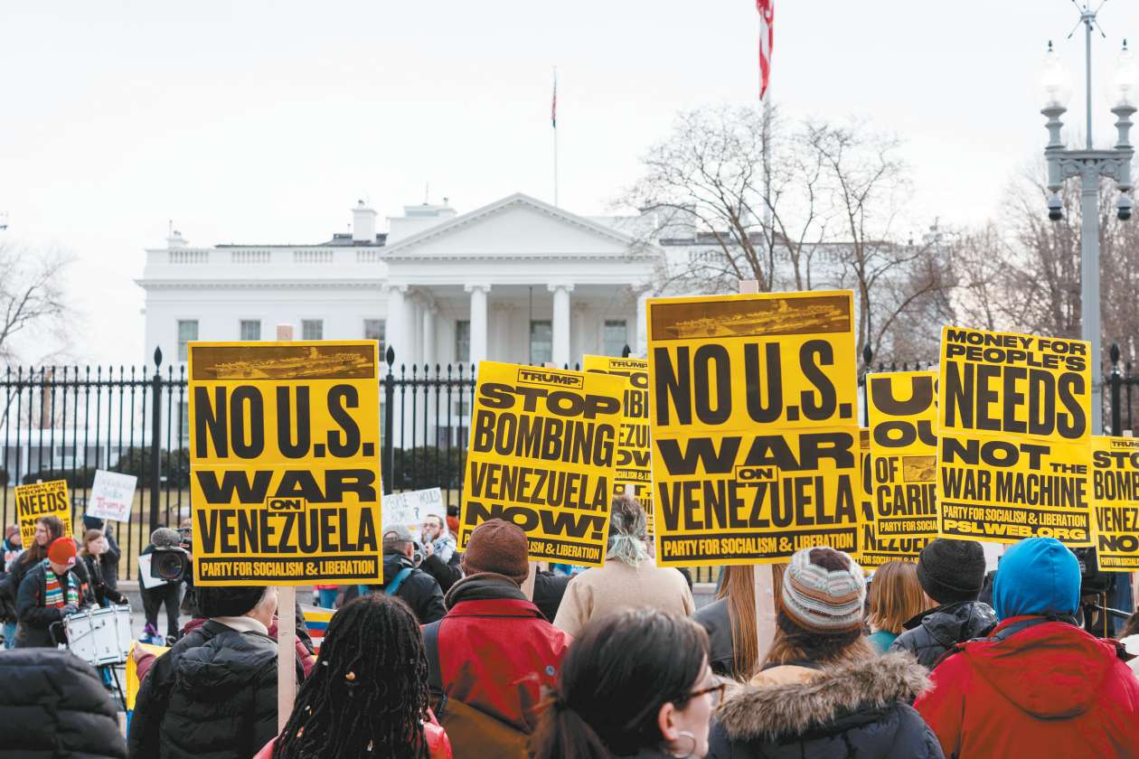 当地时间1月3日,抗议者在华盛顿白宫前手持标语,反对美国在委内瑞拉采取大规模军事行动。(视觉中国)